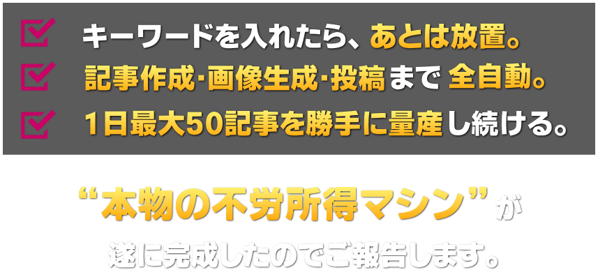 初期設定を終えて、朝起きてこのツールで作ったサイトを見たら、まさに目を疑いました。このクオリティの記事を勝手に量産してくれるなんて本当にあり得ない…。ぜひ多くの方に体験してこの感動を味わってほしいです。
