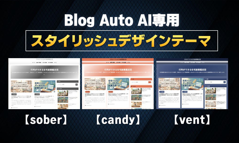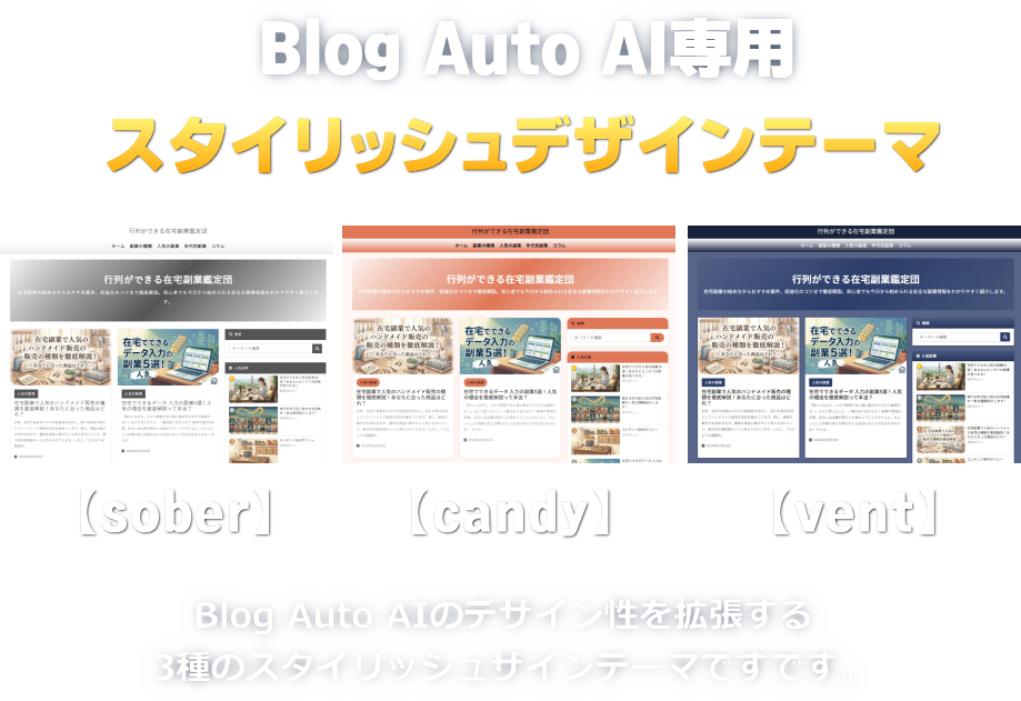 Biog Auto AIは、デフォルトで5つのデザインテーマを用意していますが、他のサイトと差別化したいという方のために3種類のスタイリッシュデザインテーマ「sober」「candy」「vent」をご用意いたしました。