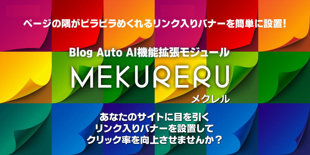 Blog Auto AI専用機能拡張モジュール「MEKURERU」を使うことで、ページの上部(右のみ・左のみ)にマウスオーバーでめくれるバナーを設置できます。めくれ前のバナーサイズは100×100pxと200×200pxから選択できます。めくれ後のバナーサイズは400×400pxです。